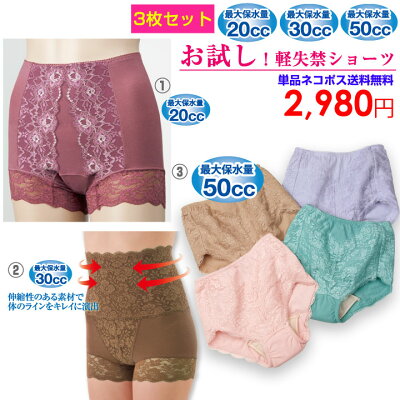 【ネコポス送料無料(代引き不可)】3種類の保水量が試せる軽失禁パンツ【インナー福袋】《M〜3Lサイズ》お試し!失禁ショーツ3枚セット